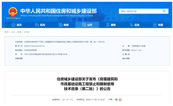 刚刚,住建部发布关于发布《房屋建筑和市政基础设施工程禁止和限制使用技术目录(第二批)》的公告(中华人民共和国住房和城乡建设部公告2024年第186号)。
