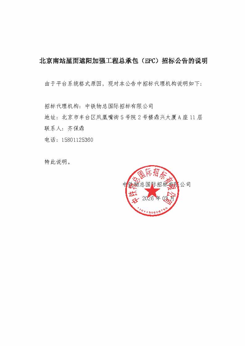 北京南站屋面遮阳加强工程总承包(EPC) 总价承包 招标公告