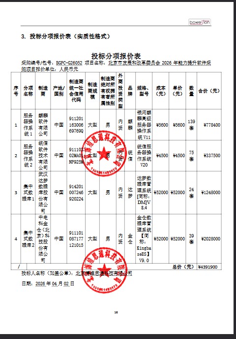 北京博维思通科技有限公司 | 集中式数据库等1批 | 金仓数据库管理系统【简称:KingbaseES】 V9.0等1批 | 1 | 439.19万元 | 439.19万元 | 详见采购文件 |